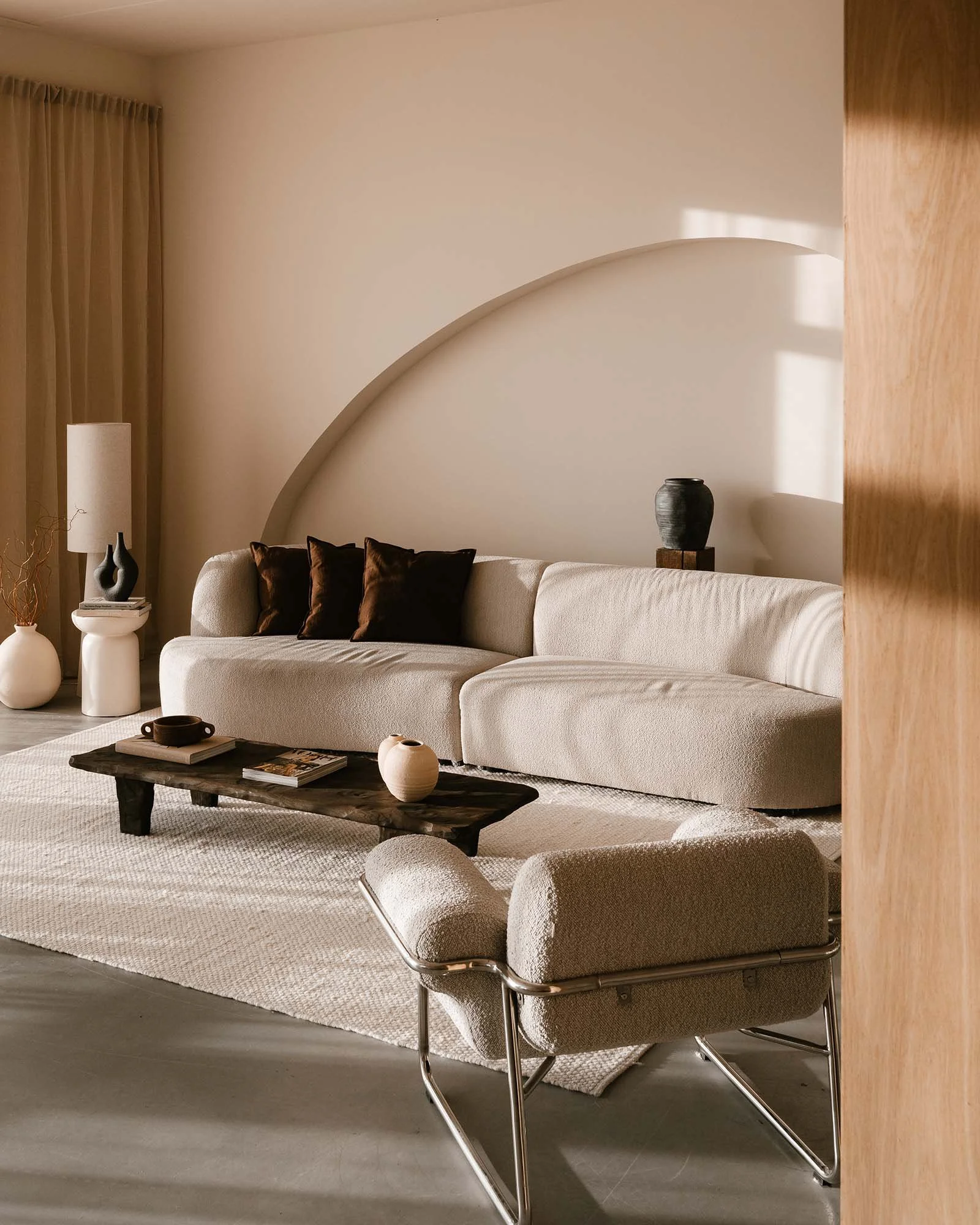 Stap je door de openslaande voordeuren de studio binnen dan krijg je direct het gevoel dat je mooie beelden gaat maken. Links zie je de Japandi Lounge met een organisch nis van 3,5 meter breed. Deze hoek is perfect voor het fotograferen van grote meubels, bedden en natuurlijk voor fashion en branding shoots. Hier vind je neutrale boucle meubels, een handgemaakte donkere notenhouten salontafel, spiegelde details, linnen vloerlamp en licht wollen vloerkleed. En……. het magische zonlicht valt hier eind van de middag en ‘s avonds prachtige naar binnen.